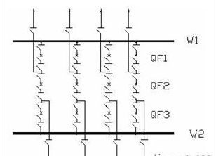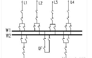 雙母線接線見圖5。具有兩組母線W1、W2。每回線路都經(jīng)一臺斷路器和兩組隔離開關(guān)分別與兩組母線連接,母線之間通過母線聯(lián)絡(luò)斷路器QF(簡稱母聯(lián))連接,每一個電源回路也是通過一臺斷路器和兩組母線隔離開關(guān)接在兩組母線上。